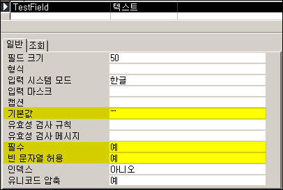 ÀÌ¹Ì ¾ð±ÞÇßÁö¸¸ Null°ªÀÌ Çã¿ëµÇ¸é ¾à°£ ¹ø°Å·Ó½À´Ï´Ù. ÀüÇô Null °ªÀ» °í·ÁÇÏÁö ¾Ê°í 'ºó °ª = ºó ¹®ÀÚ¿­' À̶õ »ý°¢À¸·Î Çʵå ÀÛ¾÷À» ÇÏ´Â °ÍÀÌ Ãʺ¸ÀÚÀÇ °æ¿ì ÀÏ´Ü ÆíÇÒ °Ì´Ï´Ù. µû¶ó¼­ À§ÀÇ Ç¥¿¡¼­ ¾Ë ¼ö ÀÖµíÀÌ NullÀÌ ÀԷµÇÁö ¾Ê°í ºó ¹®ÀÚ¿­¸¸ ÀÔ·ÂÇÏ·Á¸é Çʼö ¼Ó¼º°ú ºó ¹®ÀÚ¿­ Çã¿ëÀ» <¿¹>·Î ¼³Á¤ÇÏ¸é µÇ°Ú½À´Ï´Ù. ±×·±µ¥ ºó °ªÀ» ³Ö±â À§ÇØ Ç×»ó ½ºÆäÀ̽º ¹Ù¸¦ ´©¸£°Å³ª µû¿ÈÇ¥¸¦ µÎ ¹ø("") ÀÔ·ÂÇØ¾ß ÇÕ´Ï´Ù.(¼³¸¶ °ø¹é ¾øÀÌ µû¿ÈÇ¥¸¦ µÎ ¹ø ÀÔ·ÂÇÏ¸é ºó ¹®ÀÚ¿­ÀÌ ÀԷµȴٴ °ÍÀ» ¸ð¸£½ÃÁö´Â ¾Ê°ÚÁö¿ä?)