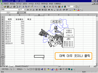 ÀÛ¼ºÇÑ µ¥ÀÌÅ͸¦ Áöµµ¿¡ ³ªÅ¸³¾ ¼ö ÀÖ½À´Ï´Ù. ¿¢¼¿¿¡¼­ Á¦°øÇÏ´Â Áöµµ¸¦ ÀÌ¿ëÇÏ¿© Àα¸ ¹Ðµµ µîÀ» Áöµµ¿¡ ³ªÅ¸³»¾î Áö¿ªº°·Î µ¥ÀÌÅ͸¦ ºÐ¼®ÇÒ ¼ö ÀÖ½À´Ï´Ù.