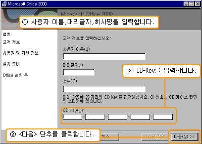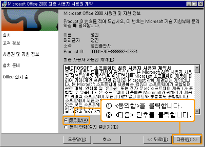 [Microsoft Office 2000 ÃÖÁ¾ »ç¿ëÀÚ »ç¿ë±Ç °è¾à] ´ëÈ­ »óÀÚ¿¡¼­ ¾Õ¿¡¼­ ÀÔ·ÂÇÑ °í°´Á¤º¸¿Í Product ID°¡ ³ªÅ¸³ª°í, ¼³Ä¡Çϱâ Àü¿¡ ÃÖÁ¾ »ç¿ëÀÚ »ç¿ë±Ç °è¾à»çÇ× ÁؼöÀÇ °æ°í¹®À» ÀÐÀº ÈÄ µ¿ÀÇÇϸé <µ¿ÀÇÇÔ> ´ÜÃ߸¦ ¼±ÅÃÇϰí, <´ÙÀ½> ´ÜÃ߸¦ Ŭ¸¯ ÇÕ´Ï´Ù.