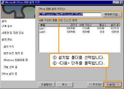 [Microsoft Office 2000 ¼³Ä¡ À§Ä¡] ´ëÈ­ »óÀÚ¿¡¼­´Â ÇÁ·Î±×·¥ÀÌ ¼³Ä¡µÉ Æú´õ¸¦ ¼³Á¤ÇÕ´Ï´Ù. ÁöÁ¤µÈ Æú´õ¿¡ ¼³Ä¡ÇÏ·Á¸é <´ÙÀ½> ´ÜÃ߸¦ Ŭ¸¯Çϰí, Æú´õ¸¦ º¯°æÇÏ·Á¸é <ã¾Æº¸±â> ´ÜÃ߸¦ Ŭ¸¯ ÇÕ´Ï´Ù.