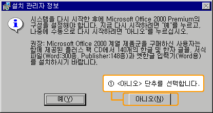 ¿ÀÇǽº2000ÀÇ ¼³Ä¡ ÁøÇà°úÁ¤ÀÌ Ã¢À» ÅëÇØ ³ªÅ¸³ª¸ç, ¸ðµÎ ¿Ï·áµÈ ÈÄ¿¡´Â ½Ã½ºÅÛÀ» Àç½ÃÀÛ ÇÒ °ÍÀΰ¡¸¦ ¹¯´Â ´ëÈ­ »óÀÚ°¡ ³ªÅ¸³³´Ï´Ù. <¿¹> ´ÜÃ߸¦ Ŭ¸¯ ÇÏ¸é ½Ã½ºÅÛÀ» Àç½ÃÀÛÇϰí, <¾Æ´Ï¿À> ´ÜÃ߸¦ Ŭ¸¯ ÇÏ¸é ¼³Ä¡ ÀÛ¾÷À» Á¾·áÇÕ´Ï´Ù.