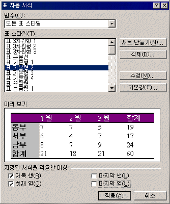 Ç¥ ÀÚµ¿ ¼­½ÄÀ» ÀÌ¿ëÇÏ¿© Å׵θ®, À½¿µ, ±Û²Ã, ¸ÂÃã µî°ú °°Àº Ç¥ Àüü ¼­½ÄÀ» ÇѲ¨¹ø¿¡ ÁöÁ¤ÇÒ ¼ö ÀÖ´Ù. ¿öµå 2002¿¡¼­´Â »ç¿ëÀÚ°¡ ÀÚÁÖ ¾²´Â Ç¥ ½ºÅ¸ÀÏÀ» º°µµ·Î ÀúÀåÇØ µÎ¾î ½±°Ô ´Ù½Ã »ç¿ëÇÒ ¼ö ÀÖ´Ù.