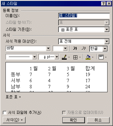 Ç¥ ÀÚµ¿ ¼­½Ä ´ëÈ­ »óÀÚ¿¡¼­ »õ·Î ¸¸µé±â ´ÜÃ߸¦ Ŭ¸¯ÇÑ´Ù. Ç¥ ½ºÅ¸ÀÏ ´ëÈ­ »óÀÚ°¡ ³ªÅ¸³ª¸é ¿øÇÏ´Â À̸§, ¼­½Ä µîÀ» ÁöÁ¤ÇÏ¿© ÀúÀåÇØ µÑ ¼ö ÀÖ¾î ´Ù¸¥ Ç¥¿¡µµ ¶È °°Àº ½ºÅ¸ÀÏÀ» ´Ù½Ã »ç¿ëÇÒ ¼ö ÀÖ´Ù.